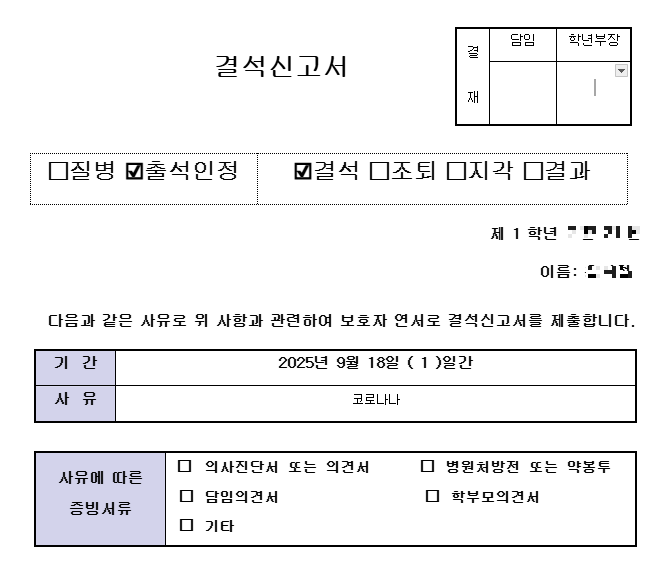 학교에서 사용중인 결석신고서를 pdf로 변환해서 위와 같이 질문했습니다.