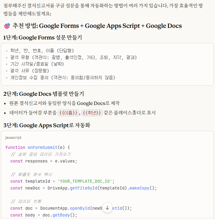 처음에는 구글 설문 응답을 받아서 자동으로 문서를 생성하는 시스템을 만들려고 했어요. 저는 코딩을 모르기 때문에 이 모든 과정을 AI와 대화를 하면서 진행해보았습니다. 그래도 올해 바이브코딩을 통해서 이것저것 만들어보았던 경험이 구글 앱스 스크립트에 대한 벽을 조금 낮춰 준 것 같아요.