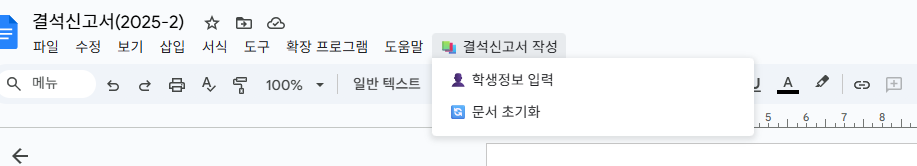 양식이 다르다면, 선생님 학교의 결석신고서 파일을 워드 문서로 저장한 후 이를 구글 문서로 불러오면 작업이 가능합니다.